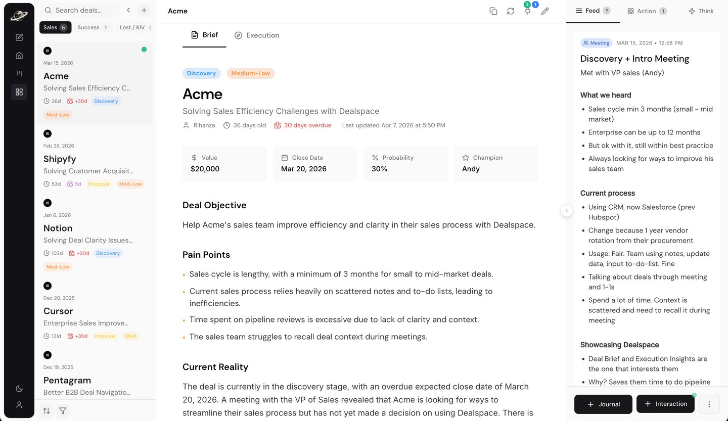 Dealspace is a system of intelligence, understanding and execution designed to close complex B2B deals with ease. No manually updated fields, no heavy customization, no learning curve. Just run your sales cadence like pro.